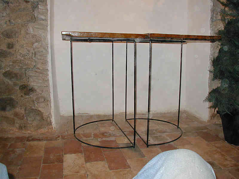 Erano i fianchi di una ribalta antica in noce nazionale del ‘ 600, lastronati e filettati, e 15 anni fa’ circa, quando ancora non si pensava al riuso, proposi di farne due consolle. La cliente era curiosa del risultato, ma non immaginava come venissero. Le bordai con della lastronatura di noce, le patinai a gommalacca e realizzai due sostegni esili in ferro battuto vincolati inferiormente. Ora sono…dipende dal momento! due tavolinetti di servizio, due consolle, un’unica scrivania avvicinandole…Comunque le usino certamente le ho salvate e ricollocate arredando.