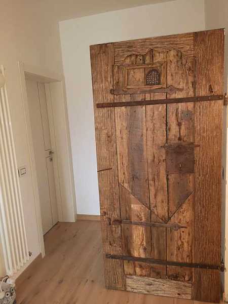 E’ stata venduta a Barbara e Cristian che l’hanno pensata come un reperto antico che da piccola porticina antica parte di un grande portone, ne hanno voluto fare una porta antica. Anzi la Loro porta antica progettata a misura per lo spazio interno moderno della loro casa a Reggio Emilia. Sarà trasformata per essere adattata alla luce muraria che è più grande della porticina antica. Sarà affiancata da porte molto moderne color avorio cercando di sfruttare e giocando sulla diversità, cercando l’esasperato contrasto.
