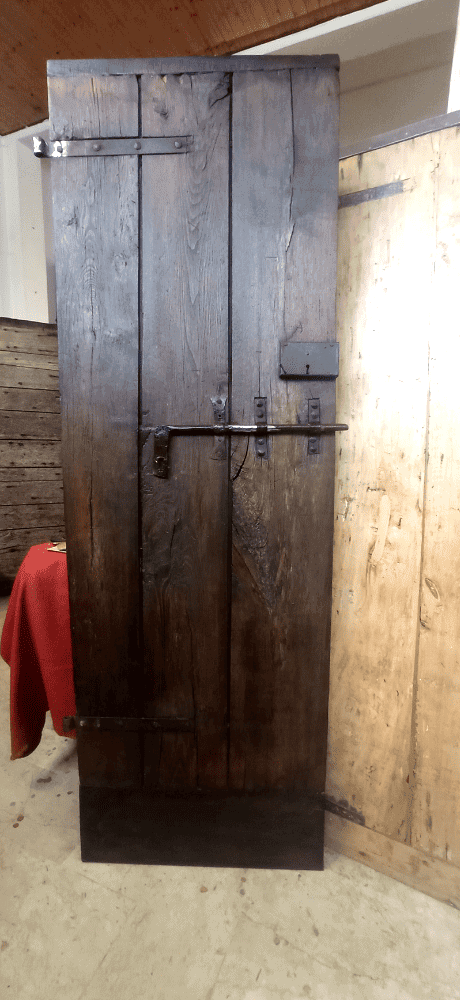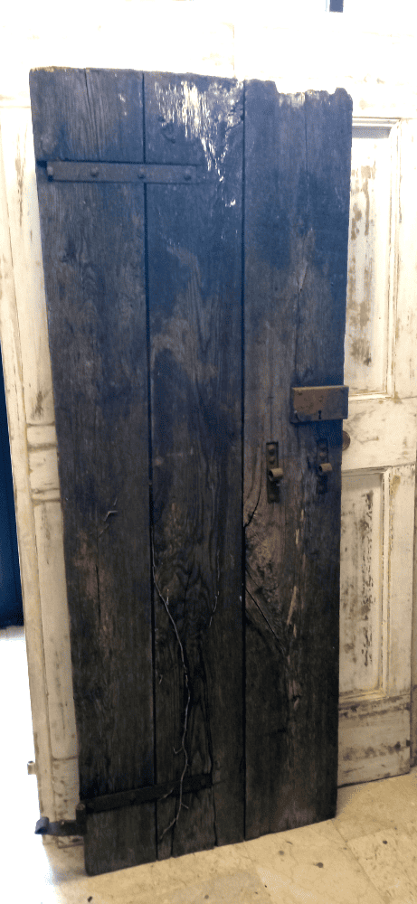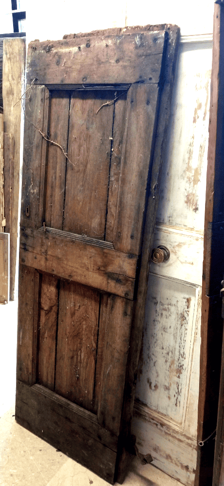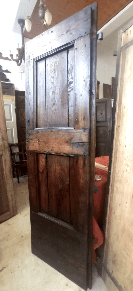 Antica porta tutta fatta a mano senza macchine, probabilmente da un contadino. Forse era la porta antica granaio. In castagno selvatico, è dell’ 800. Si presenta così come il tempo l’ha trasformata, abbrutita, ma anche arricchita. Sì, arricchita di quelle sfumature di colore che solo dopo la pulitura emergeranno. Sfumature imprevedibili che scolorano il castagno in alcune zone. In altre zone invece colorano il castagno esposto per anni al sole ed all’acqua, al freddo ed al caldo. Sarà allungata rimuovendo l’immarcimento che nelle zone inferiori è quasi sempre presente quando le porte appoggiano sulla nuda terra. Su questa porta un’edera si è arrampicata creando una commistione scenografica tra una pianta rustica e la porta pure rustica. Sono diventate due amiche, anche se poi la porta vive e vivrà ancora e l’edera non più seccandosi. Dopo l’allungamento la porta rustica del passato ha misure di 206 x 68 esterne e 62,5×201 interne.