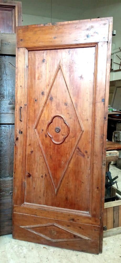 Bella porta antica in larice ad anta unica. Provenienza Bologna. Porta antica decorata con particolare decorazione rilevata dal fondo con losanga(rombo) tipicamente Neoclassica unita a elemento floreale barocco in posizione centrale, stilizzato. Presenta marletta o saliscendi non comune. Infatti invece di essere in metallo è in legno. Dell’800, doveva presentare la facciata decorata lungo un corridoio dove era necessario fosse scenografica, mentre internamente è liscia. Caratteristica di molte porte antiche, quella di presentare decorazione solo nelle zone a vista e posteriormente lisce, meno curate. Misure 85 x 196, ma allargabile ed allungabile. Ottima per meditare in una sala decor new age.