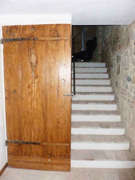 Altro esempio di porta antica in castagno scorrevole che arreda interno moderno.