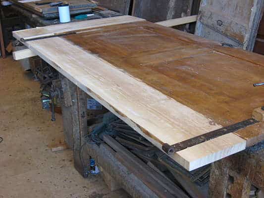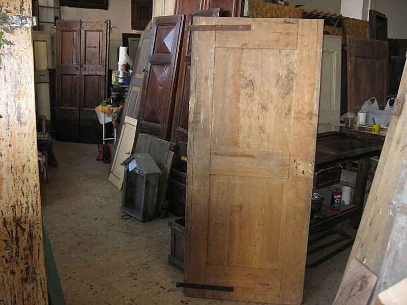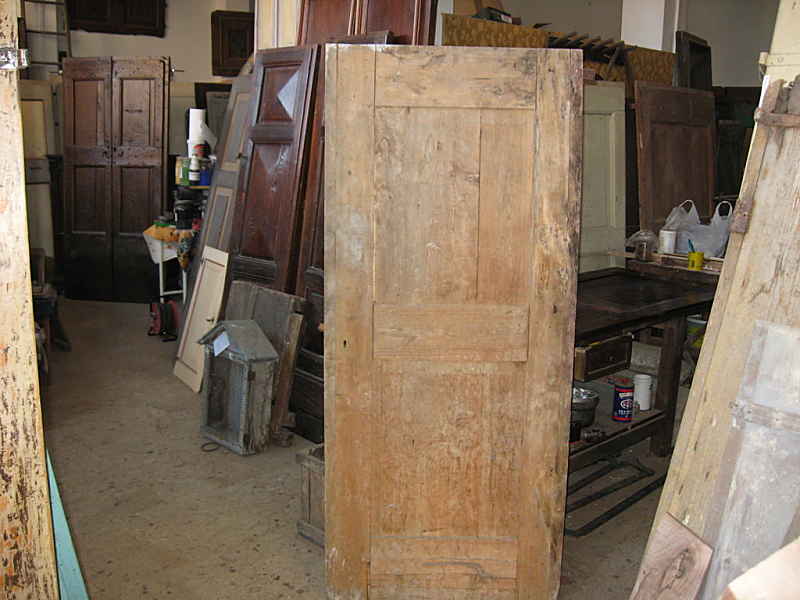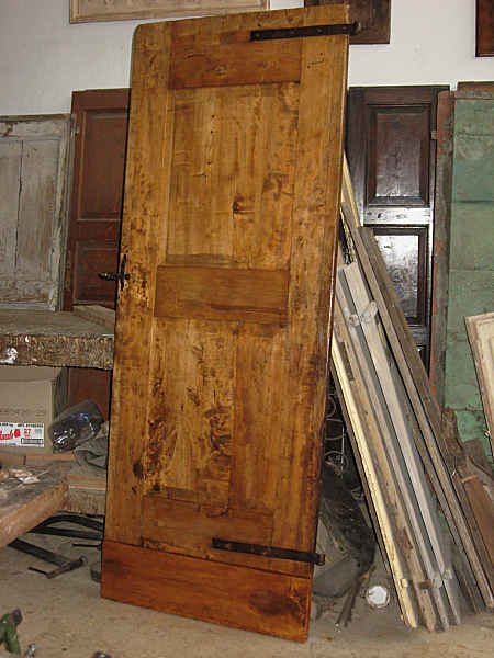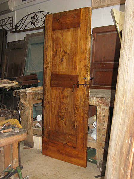 Probabilmente fatta a mano da un contadino e in pioppo. Una delle porte antiche delle case di campagna, umile, semplice, materica, solo legno e manualità, null’altro. Tavole di pioppo segate a mano, neanche piallate, e senza selezionare le tavole del tronco dal basamento. In altre parole alcune tavole sono state segate dalla parte più vicina alle radici, tanto che alcune zone presentano le caratteristiche deliziose della radica. Difatti la radica ha i piccoli nodini circolari di colore bruno, rispetto al colore bianco giallo del resto della porta. Chiara, luminosa, è fatta con un legname povero, leggero, ma in campagna molto utile. Una volta veniva utilizzato(soprattutto la radica di pioppo) anche in liuteria e per farci i manici dei coltelli. La vedete prima e dopo il restauro, l’allungamento e la finitura, col suo tono biondo e caldo.