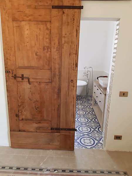 Il titolare di un’impresa edile l’ha acquistata, su richiesta del Suo cliente, per un casale dove stanno operando una ristrutturazione nella campagna Romana. Come potete vedere dalle foto, è stata montata come porta antica rustica scorrevole dopo essere stata allargata e allungata alla misura voluta dal cliente e collocata raso muro col mio kit scorrevole.