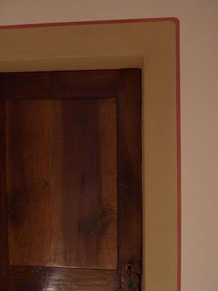 Un dettaglio della porta antica in noce collocata nell'interno, con la decorazione murale di contorno che la completa.