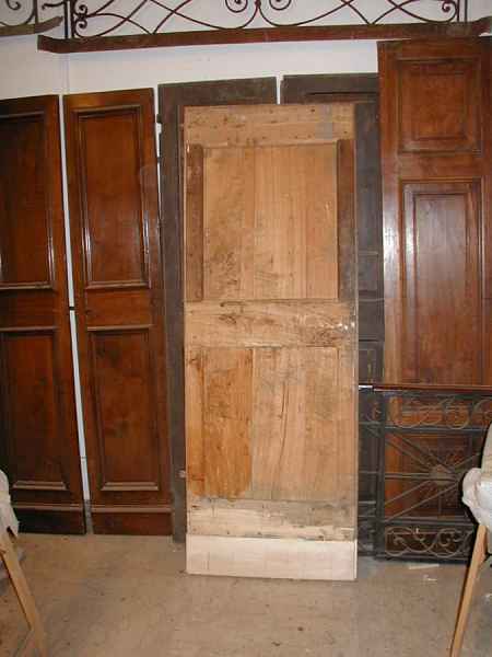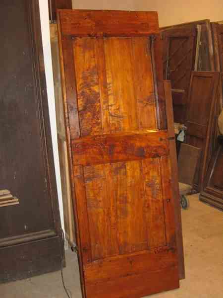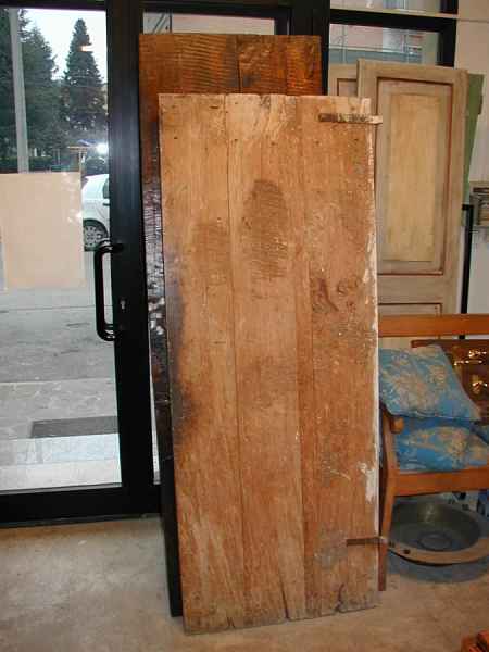 Porta antica rustica dell ’800, in pioppo, fatta a mano. Sono molto evidenti i segni della sega a mano utilizzata per segare le tavole, probabilmente da un agricoltore nell’inverno. Quando la terra riposa e i lavori agricoli sono sospesi, davanti al camino col legno raccolto nelle estati precedenti e stagionato in catasta si lavorava.