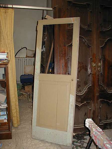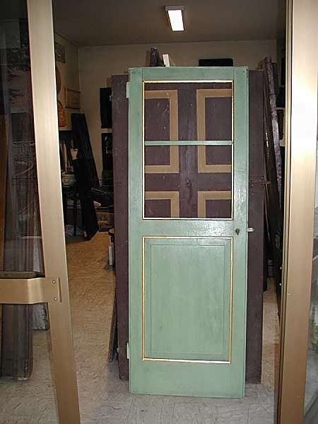 Una vecchia porta laccata, a giorno(cioè con vetro). Usata in origine come porta di una cucina. La vedete prima del restauro e della laccatura a mano e dopo, restaurata e laccata nel colore originale. Presenta nella cornicetta di battuta attorno al vetro e nella stessa cornicetta della specchiatura inferiore, un filetto di contrasto realizzato a foglia d’oro. Misure 68 x 195. Presenta la tipica chiusura antica a saltarello in ferro battuto.