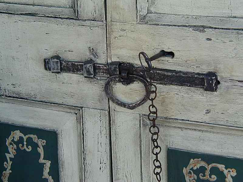 Piccola porta antica rustica laccata e dipinta. Del ’700, proviene dalla montagna modenese. Laccata di nuovo a mano nel rispetto dei colori originali. E’ stata dipinta in alcune zone ripristinando le poche tracce presenti e restaurata. Completa di catenella, chiave, serratura e catenaccio originali forgiati e fatti a mano. Successivamente è stata completata con un sovrapporta in legno laccato nel colore della porta e anticato. Non più disponibile. Altra porta antica laccata.