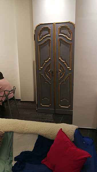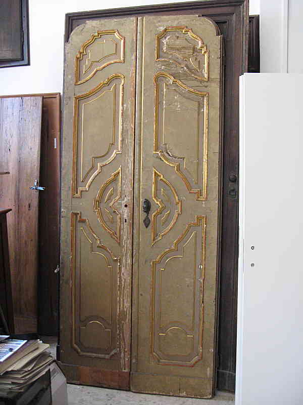 Una antica porta laccata e dorata che sarà trasformata e modificata dal colore originale nocciola chiarissimo nel re dei colori di tendenza moderni, il grigio.