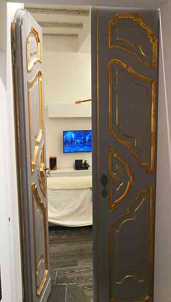 Come appare il portone antico laccato e dorato dopo il restauro ed il cambiamento di colore in un interno di tendenza