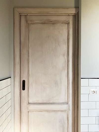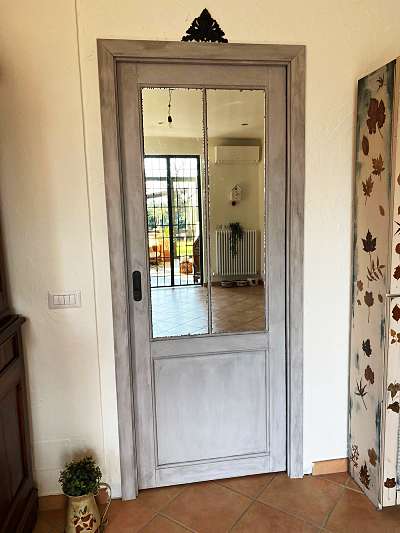 Due porte scorrevoli nuove a scomparsa interno muro di Ylenia, che saranno laccate a mano solo a pennello. La laccatura sarà realizzata nel colore voluto dalla cliente e il colore grigio sarà peraltro anticato per dare quella sensazione di vissuto e vintage che manca a una verniciatura industriale. Su una delle due saranno applicati nel riquadro superiore due specchi antichi, anche questi ulteriormente anticati togliendo a mano piccole parti di vetro per dare un impronta forte di usato alle porte. Ho fornito ad Ylenia anche due sovrapporta antichi che le completano.