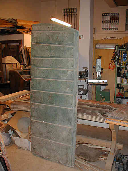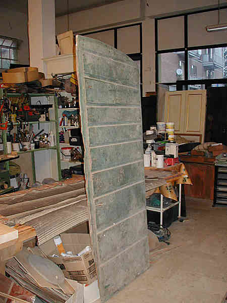 Un battente del portone durante la fase di laccatura a mano, solo a pennello. Da notare che i solchi prodotti dal rampicante, per volontà del cliente, sono stati mantenuti, puliti e consolidati a vista.