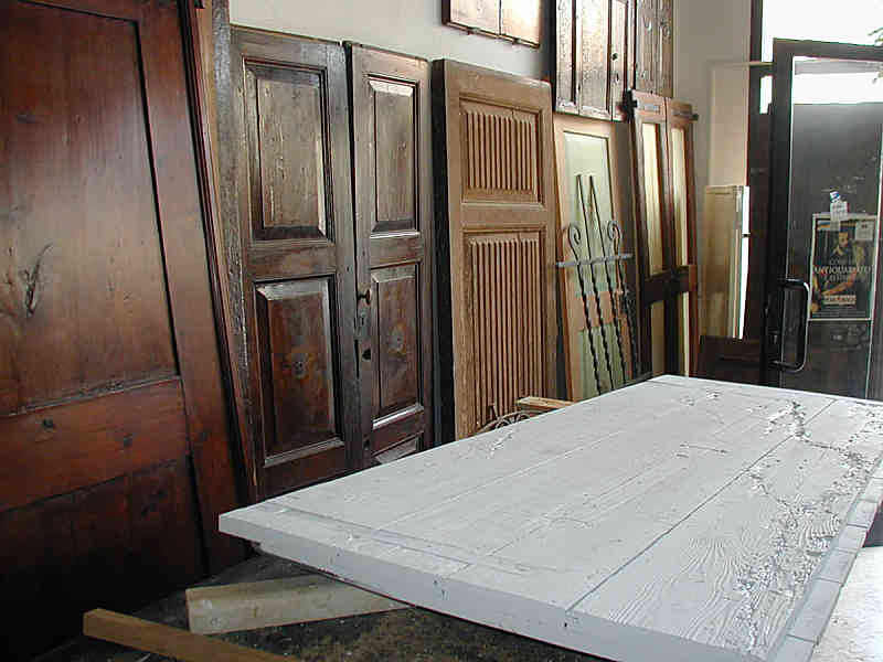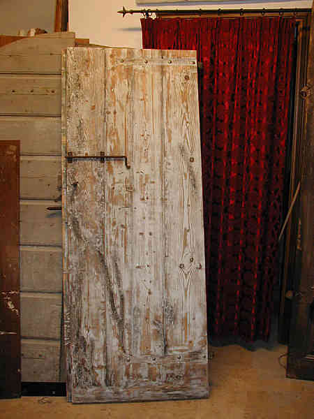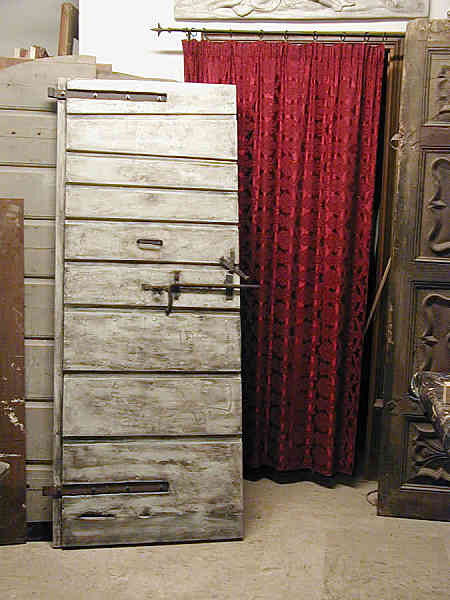 Era un vecchio portone di una cantina o di una stalla centinato(curvo in alto), verniciato a smalto di colore verde. L’ho restaurato e trasformato totalmente. Intanto cambiando l’apertura(da spingere a tirare) e rimuovendo la centinatura. Poi oltre al restauro sono state eseguite due finiture, sul retro una Shabby Chic tradizionale e naturale, frontalmente invece, solo usura, finto sporco e anticatura, ma senza portare a vista il legno sottostante, una finitura che oggi si definirebbe materica.