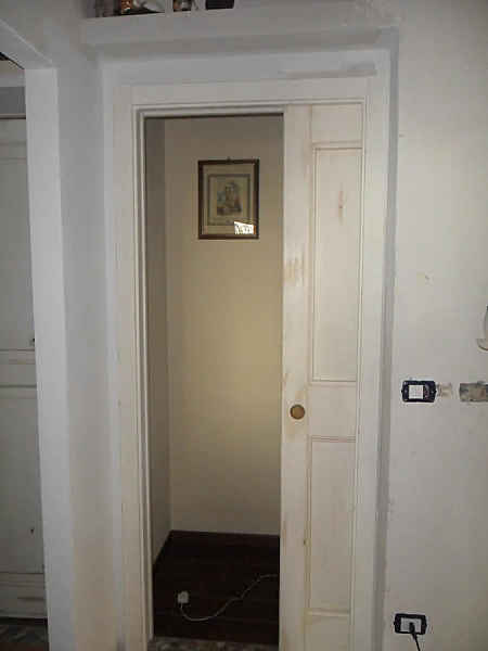 Questa è una scorrevole nuova, come quelle di una volta, ma scorrevole con infisso a scomparsa(tipo Scrigno o Eclisse). La soluzione più innovativa e di tendenza per recuperare spazio. In una delle foto noterete il kit dei profili(kit cassone) necessari al montaggio della porta scorrevole. La porta, come tutti i profili, sono stati laccati a mano, solo a pennello con finitura Shabby Chic Naturale e personalizzata(in questo caso con pochissimo consumo e usura del colore come la cliente mi ha chiesto).