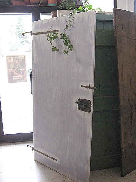 La porta antica restaurata e finita in shabby chic naturale nella vista posteriore